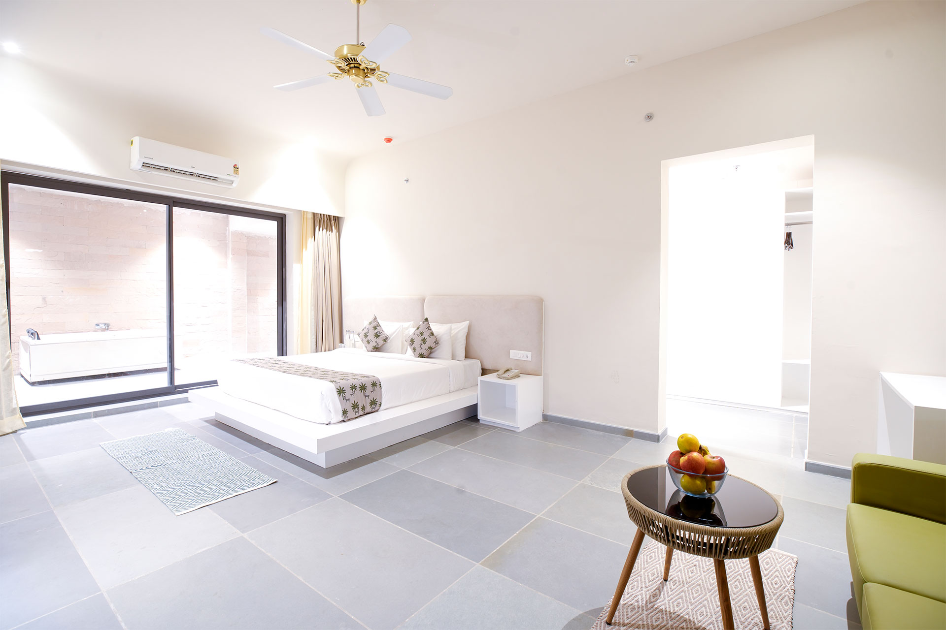 Slip into the warm jacuzzi, unwind under the sky and let time slow down as you enjoy a refreshing, therapeutic soak. Inside, the room features refined décor, comfortable bedding and modern amenities that enhance your stay.